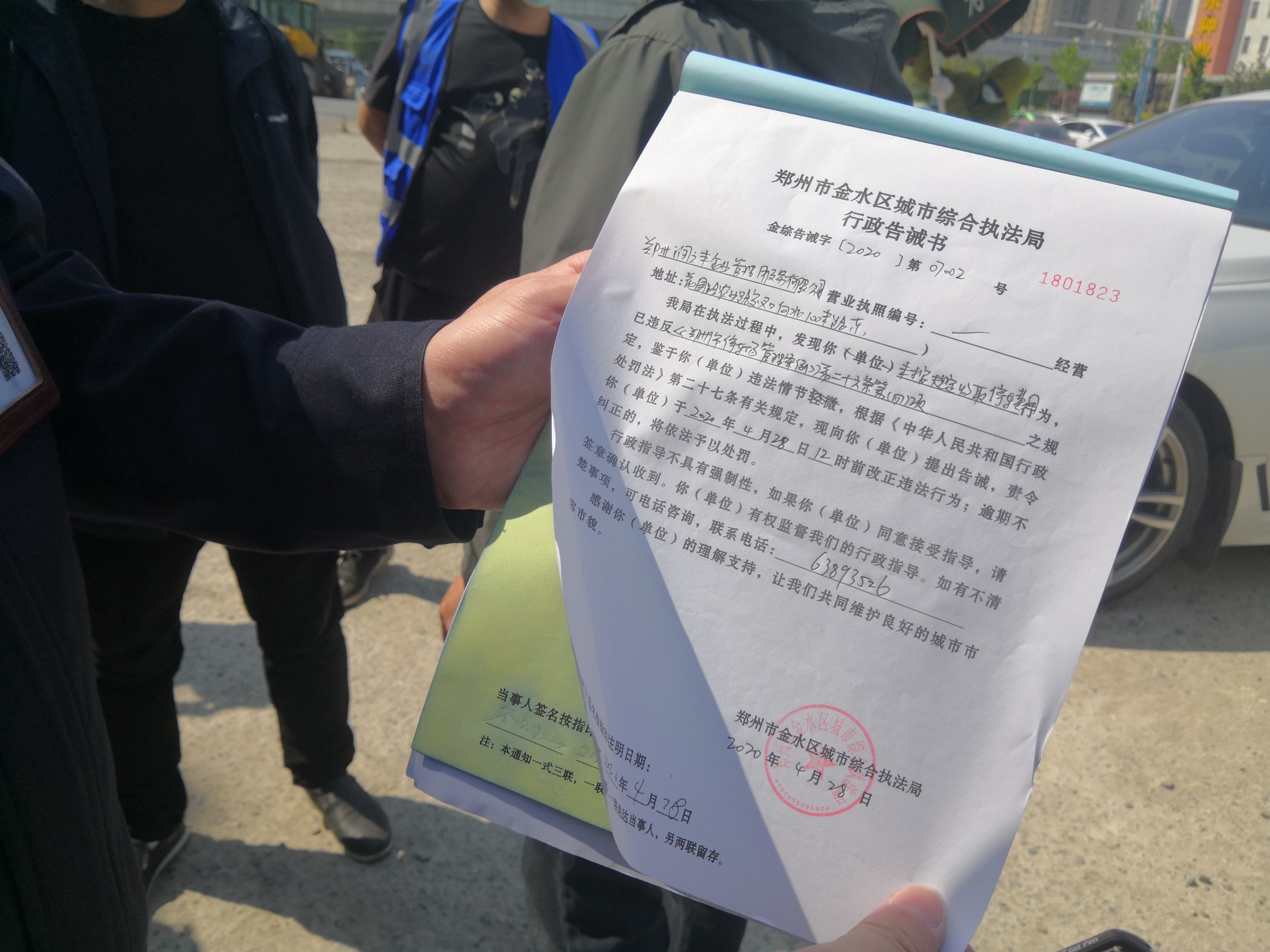 4月28日上午,郑州市金水区两级城管执法、市场监督、公安等多部门联合出动,现场对该违规停车场进行查处,当场下发“行政告诫书”,责令立即停业整顿。