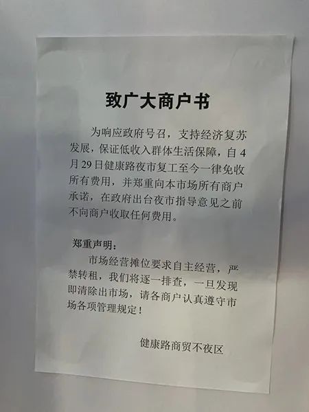 市场管理方工作人员告诉记者,在前不久,他们在夜市公告栏上张贴了《致广大商户书》,上面很明确写道:“自4月29日健康路夜市复工至今一律免收所有费用”以及“严禁转租,将逐一排查,一旦发现即清除出市场”等字样。“转租行为是明令禁止的,我们正在就这个问题进行市场整顿。”工作人员说。