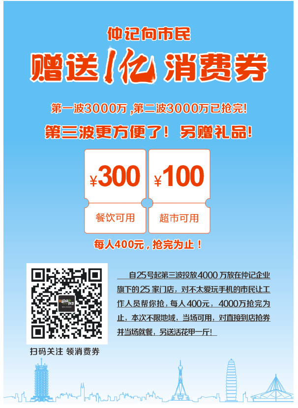 4月23日,由郑州市金水区工商联联合仲记发起的“向市民赠送1亿消费券”活动推出后,市民踊跃参与,第一次和第二次投放6000万已抢完,但也有市民反映说,一直没抢到;还有一些不太爱玩手机和年龄稍大的市民反映,无法参与……自4月25日起,第三波4000万元开抢,除了微信公众号抢券外,不太玩手机的市民可到仲记25家门店,让工作人员帮忙领取,当场可使用,对直接上门领取者,另送活花甲一斤。