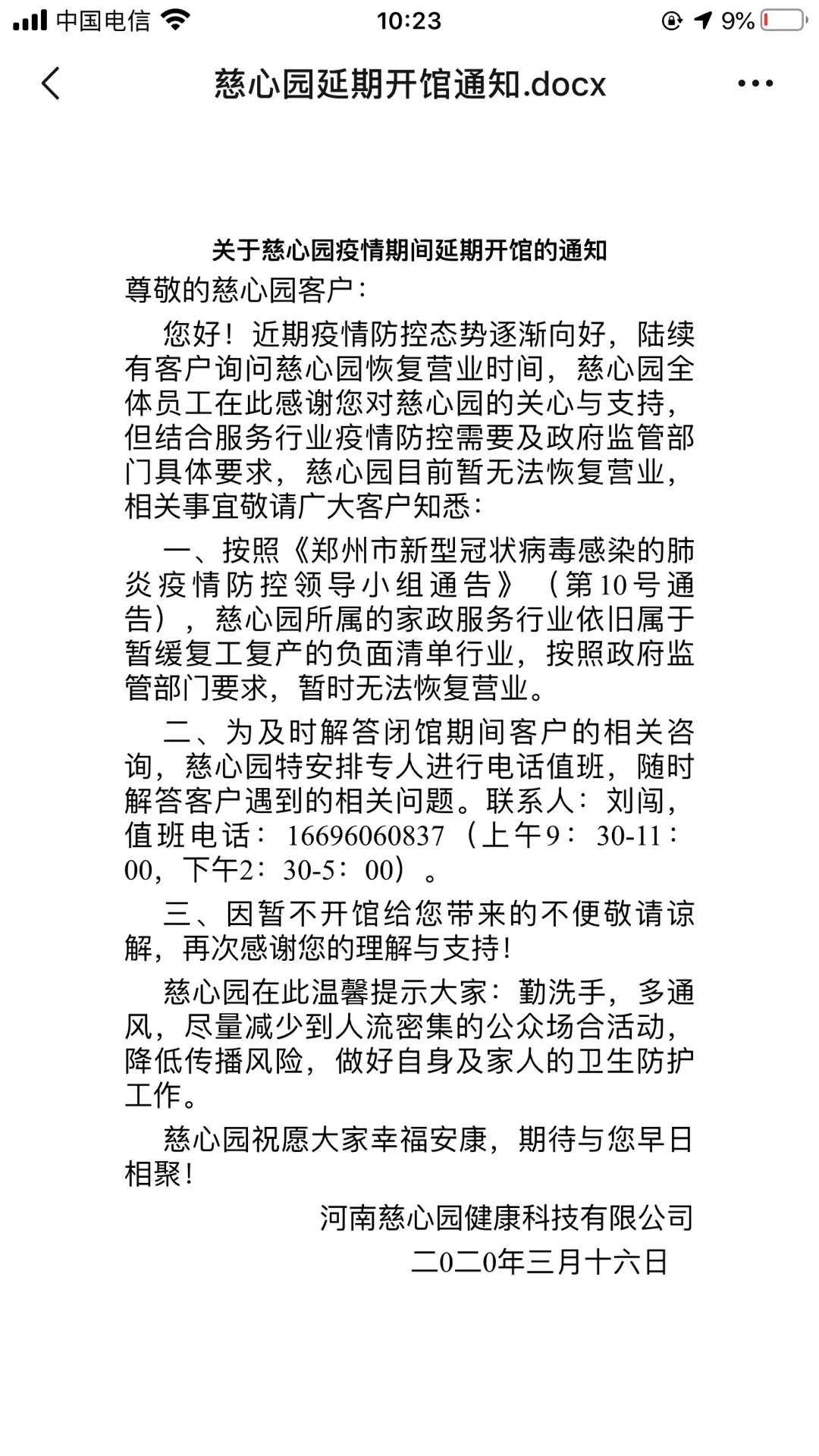 3月16日,慈心园发布延期开馆通知,称“根据郑州防疫第10号通告要求,慈心园所属的家政服务业依旧属于暂缓复工复产的负面清单行业,按照政府监管部门要求,暂时无法恢复营业。”