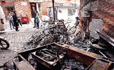 在凌乱的电动车铁架南侧,有一个被大火烧成黑色的煤气罐和一辆面目全非的三轮车。两辆电动车的铝质轮毂都已融化成铝块儿状。