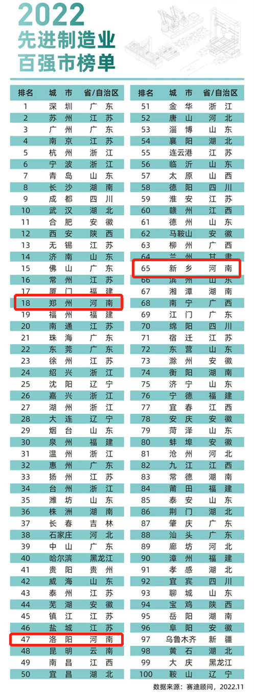【大河财立方消息】11月24日,赛迪顾问发布2022先进制造业百强市报告,深圳、苏州、广州位列前三甲。河南3地入选,郑州第18位、洛阳第47位、新乡第65位。