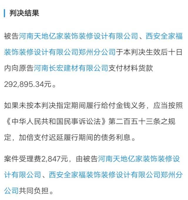 河南商报记者通过企查查搜索发现,在全家福郑州分公司的企业信息中,有一份高新区人民法院审理的一份买卖合同纠纷一审民事判决书,判决结果为被告河南天地亿家装饰装修设计有限公司、西安全家福装饰装修设计有限公司郑州分公司于本判决生效后十日内向原告河南长宏建材有限公司支付材料货款292,895.34元。