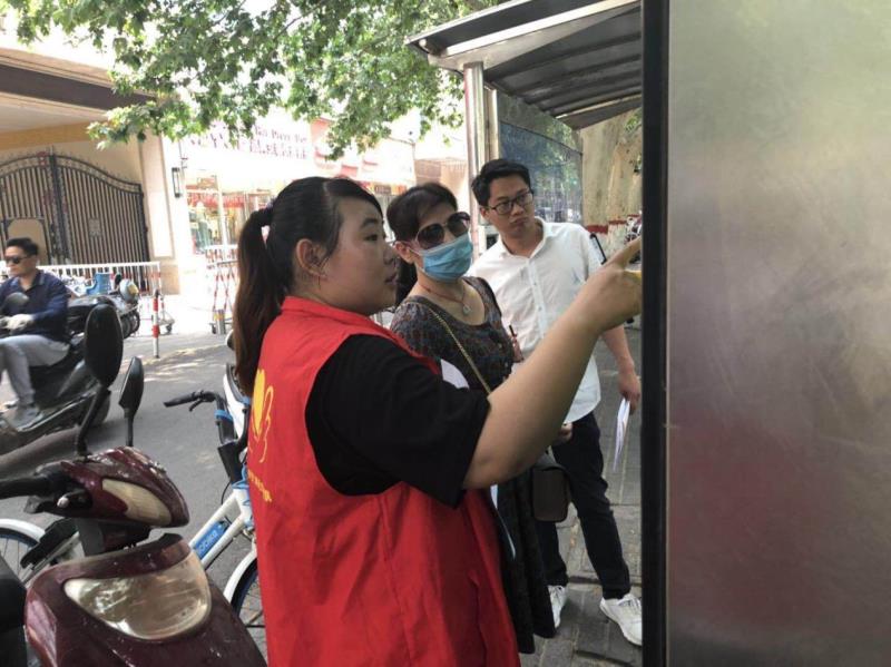 活动中,志愿者身着红马甲,在公交站点积极向候车乘客进行线路优化调整的相关信息。