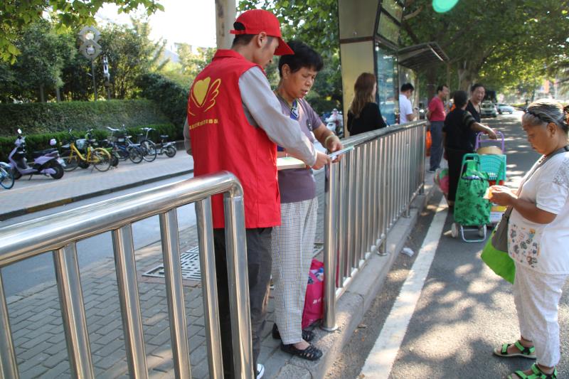 活动中,志愿者身着红马甲,在公交站点积极向候车乘客进行线路优化调整的相关信息。