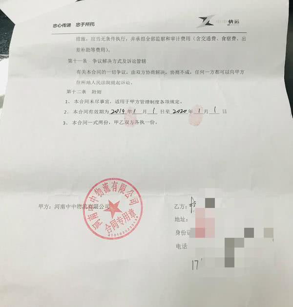 12月18日,中中快运信阳分公司负责人杨女士提供了今年加盟时双方签订的合同,但关于是否退费,合同中并未注明。