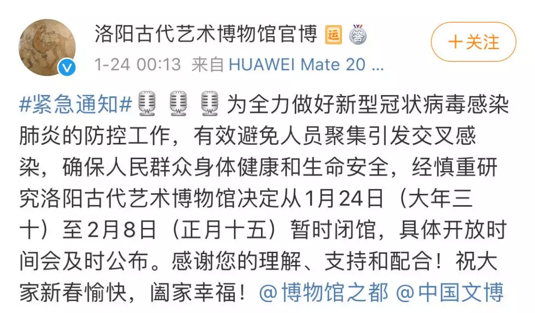 与此同时,洛阳古代艺术博物馆决定从1月24日(大年三十)至2月8日(正月十五)暂时闭馆,具体开放时间待定。