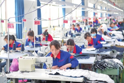 光山县寒诗羽服饰有限公司的生产车间内一派繁忙景象,当地居民在家门口实现就业