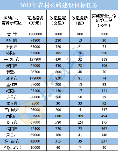 【大河财立方消息】7月20日,河南省交通运输厅下发通知, 调整2022年全省农村公路建设目标任务。结合我省农村公路建设实际,将全省农村公路建设投资由90亿元提高到120亿元,新增完成投资30亿元;改造农村公路由5000公里提高到7000公里,新增2000公里;实施安防工程由2000公里提高到3000公里,新增1000公里;改造农村公路危桥由600座提高到800座,新增200座。