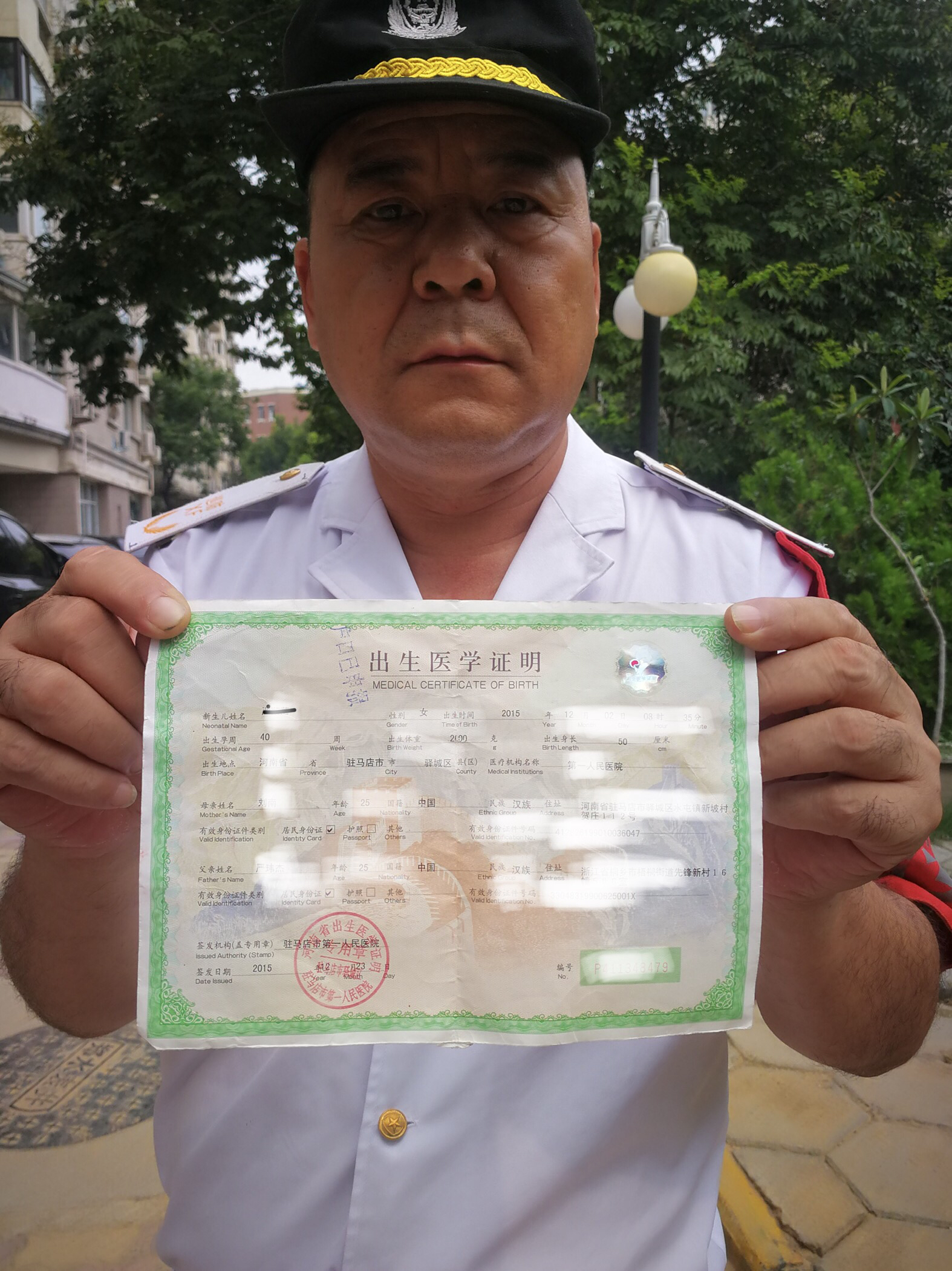 8月9日下午3时许,金水区凤凰台巡防队员李宪宾、海亚楠二人,巡逻到建业路建业城市花园附近的一个垃圾筒旁,发现地上扔着一纸《出生医学证明》,上面显示:新生儿的姓名、性别、出生时间、出生地点和孩子父母的姓名。考虑到孩子将来申报户口和其它证明时,都需要用出生证明,两名队员立即向中队领导进行了汇报。中队领导要求他们想方设法找到失主,尽快把出生证明送还。