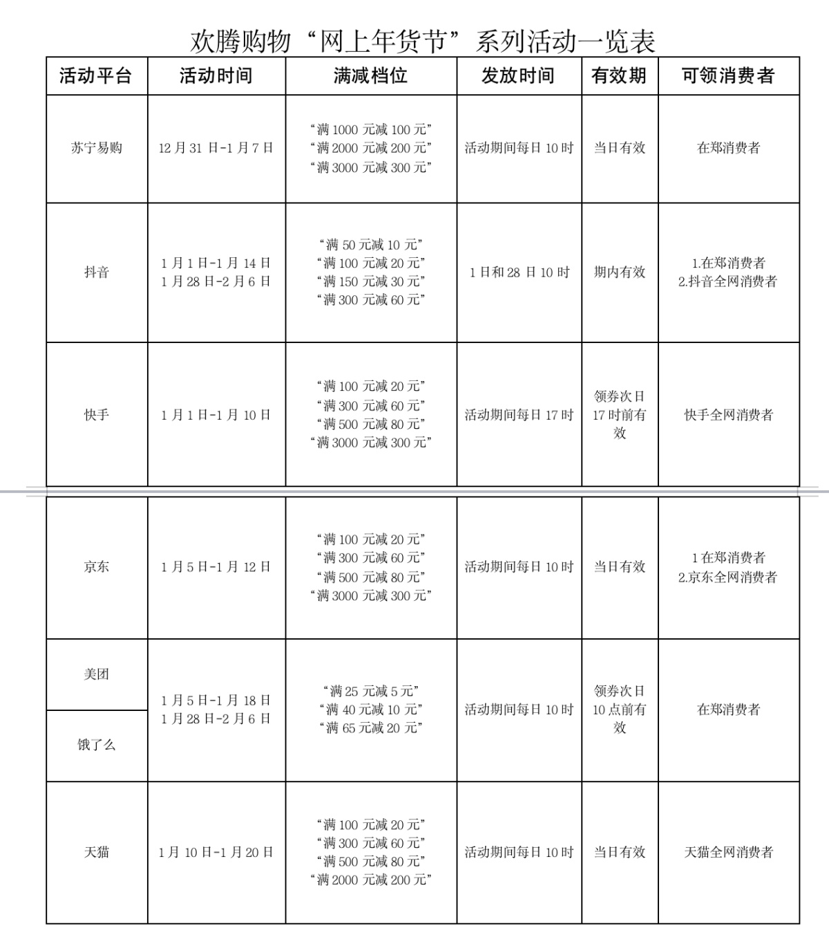 2023年1月5日-12日,将在京东平台面向在郑消费者和全网消费者发放电商消费券2000万元,共有“满100元减20元”“满300元减60元”“满500元减80元”“满3000元减300元”四个满减档位。
