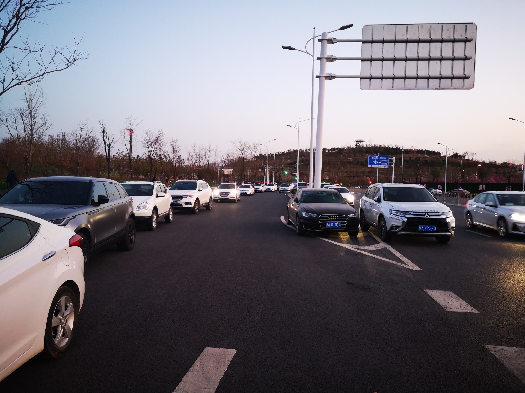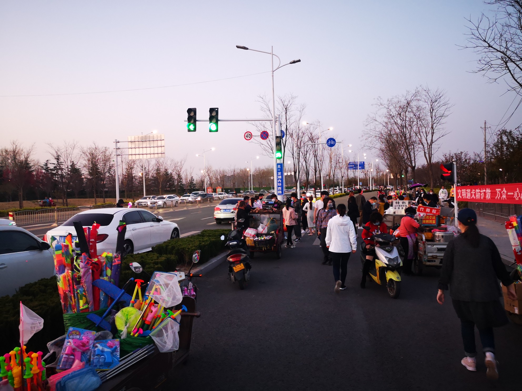 3月18日傍晚,大河报•大河客户端记者来到了北龙湖湿地公园。此时,虽已夕阳西下,但公园门口两侧路边仍停放有大量的私家车。门口处有卖小吃的,风筝等玩的流动三轮车,一些人员围观在一起,有的并未戴口罩。