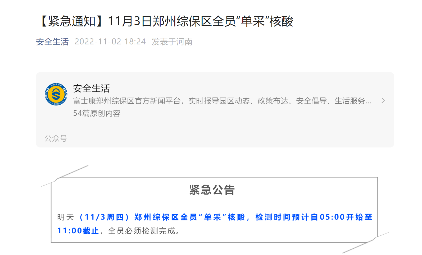 紧急通知!11月3日富士康郑州综保区全员“单采”核酸
