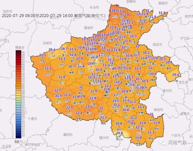 中午时分 炎热感上线,今日气温:30℃+,豫北略高32-34℃,其他30-32℃