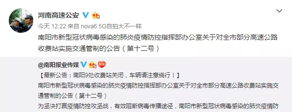 南阳市新型冠状病毒感染的肺炎疫情防控指挥部办公室关于对全市部分高速公路收费站实施交通管制的公告