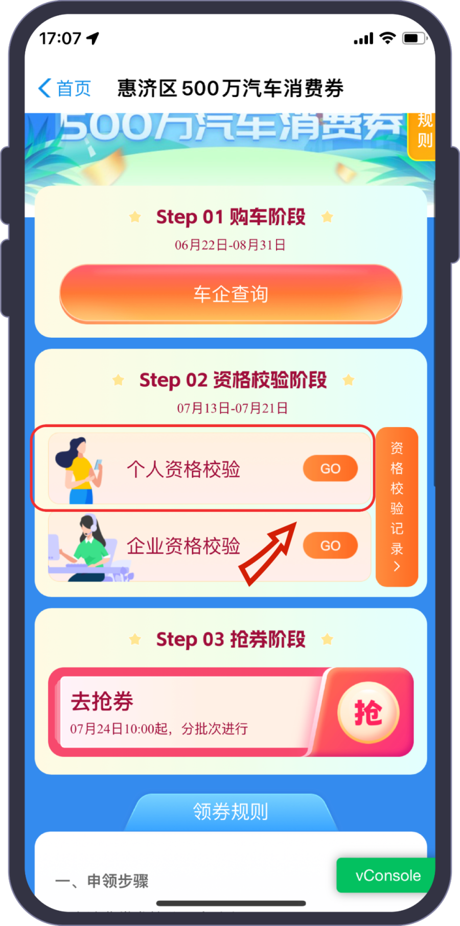 含2张500元消费券、5张200元消费券。按照购车发票价税合计金额,购车裸车开票价在15万元(含)以上的小型非营运车辆有机会领取。