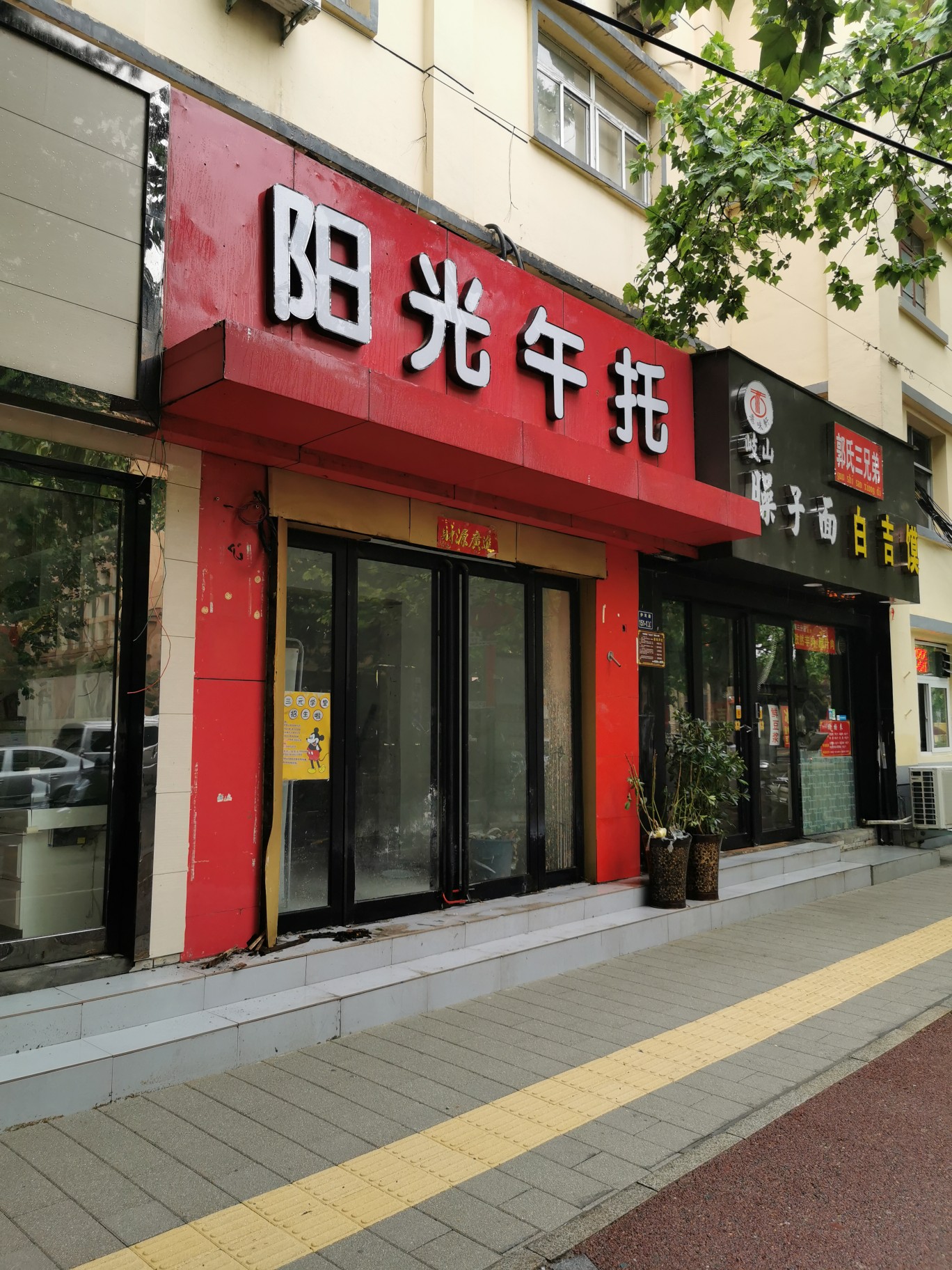 8日上午8点多钟,记者在阳光午托门口看到,大门紧锁,屋内停放着电动车、塑料桶等杂物。玻璃橱窗上,张贴着一张某培训机构的招生简章,从字面上看,与该午托没有关联。通往阳光午托的侧门,也是大门紧闭。