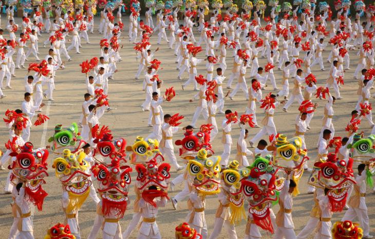 《东方雄狮》作为群众游行活动中第二个情境节目,由塔沟武校1080名师生共同演绎,整个节目以张驰有力、威武雄壮的舞狮表演,寓意不断崛起和日益强盛的中国,焕发出强大的生机和活力。演员们以舞狮为主要表演形式,通过快速移动和变换点位,首尾相接组合成各种造型。表演开始后,塔沟武校180名小学员扮演成“小狮子”飞奔上场,并做出翻滚、跳跃等动作,360人手拿绣球与360个“大狮子”捉对舞动,时而围拢聚集,时而圈点成圆,并将金鸡独立、腾空飞脚、怀中抱月等武术动作巧妙展示出来。