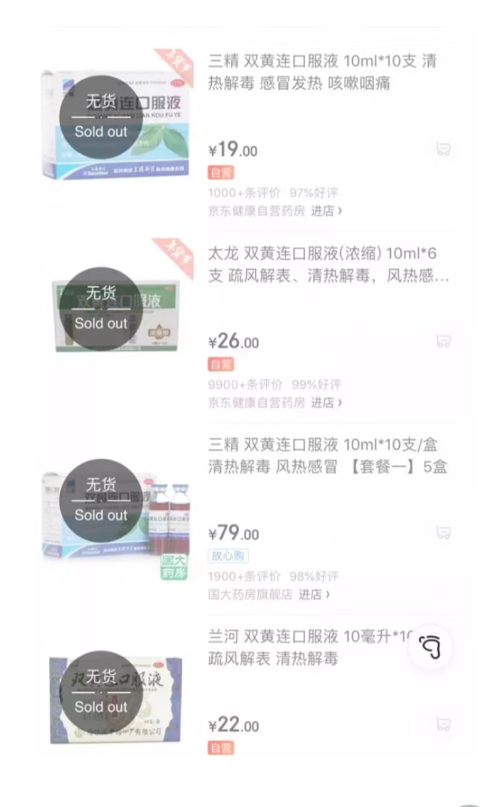 消息发布后,引发村民抢购潮。淘宝、京东等线上网店均已断货。而线下实体店,大河报·大河客户端记者探访驻马店上蔡黄埠镇多家药店、诊所等地,中成药双黄连口服液大多被售罄。