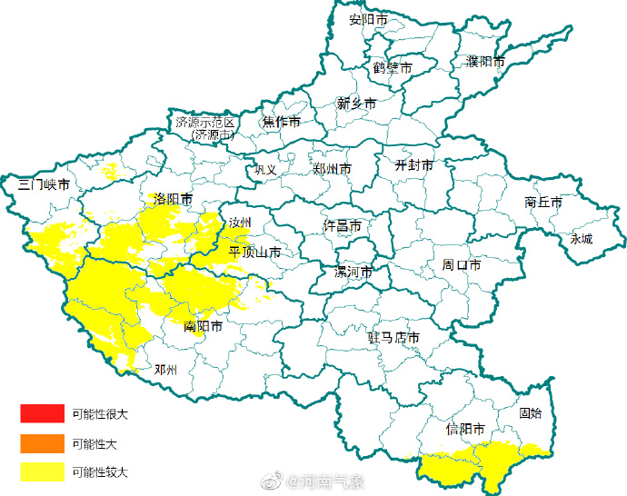 洛阳市宜阳县、洛宁县、伊川县、汝阳县、嵩县、栾川县,平顶山市宝丰县、鲁山县、叶县、汝州市,三门峡市陕州区、卢氏县,南阳市卧龙区、西峡县、南召县、方城县、内乡县、淅川县、镇平县,信阳市罗山县、光山县、商城县、新县、固始县,发生地质灾害的可能性较大。
