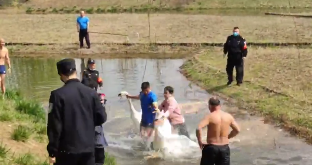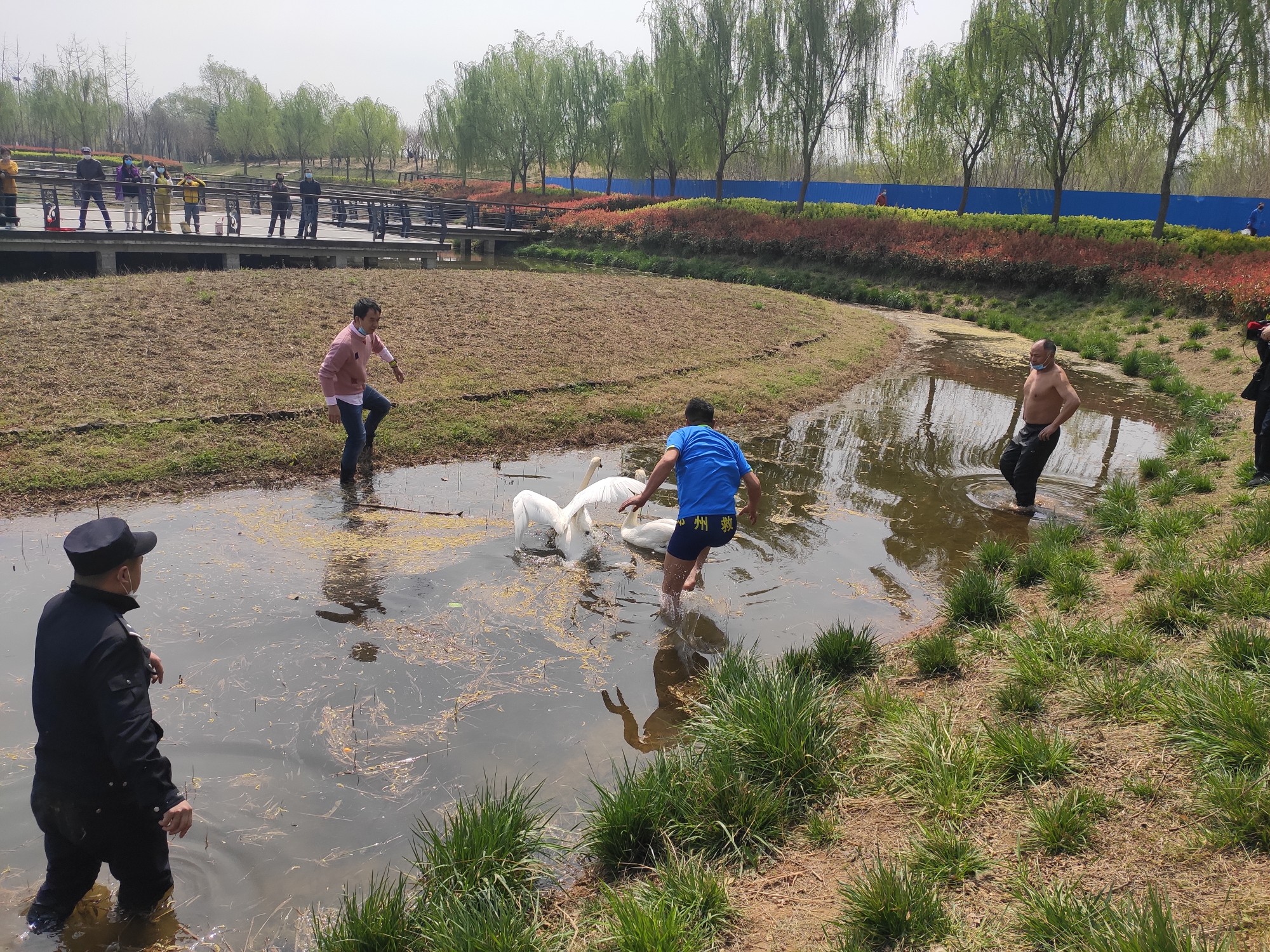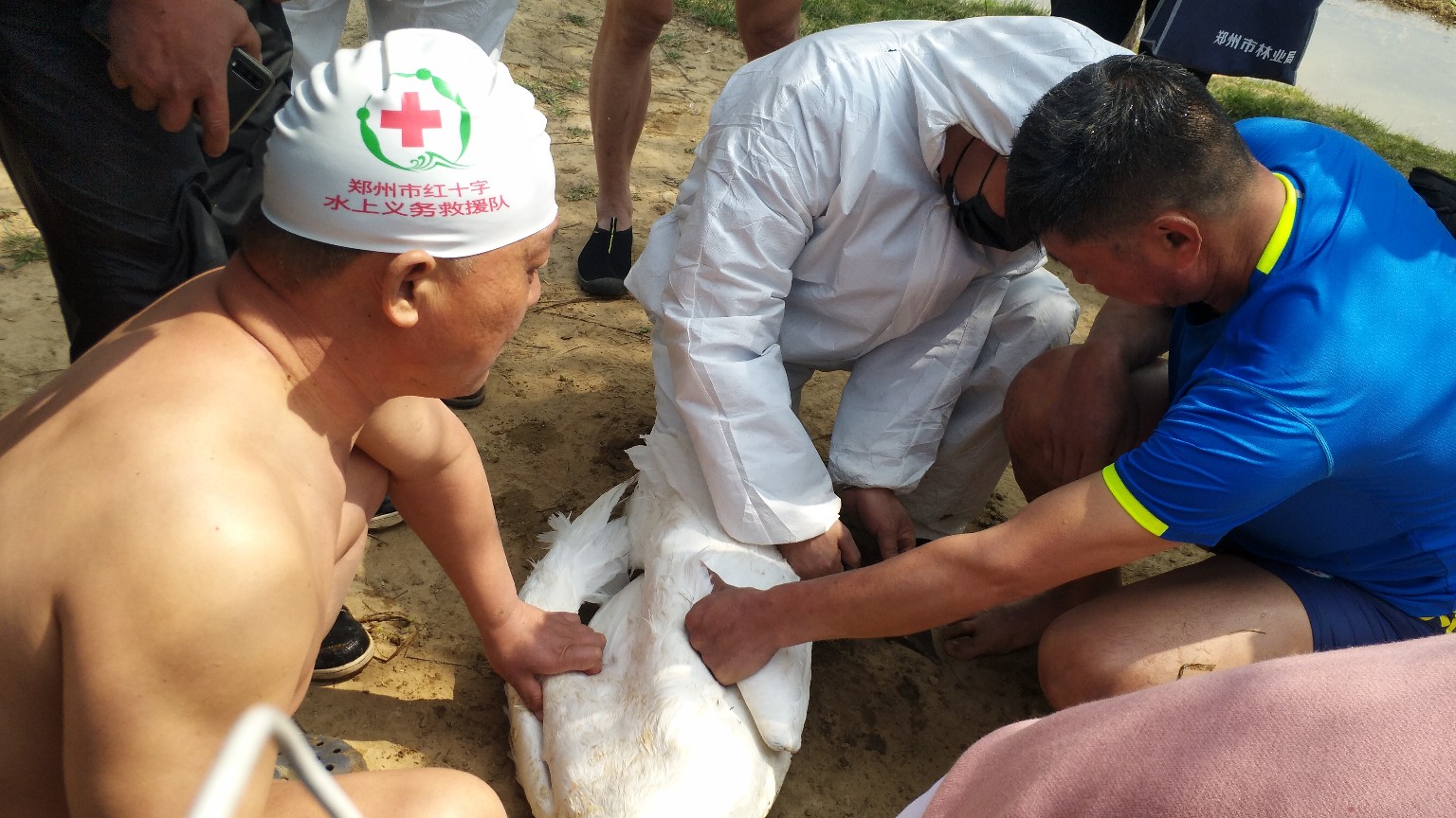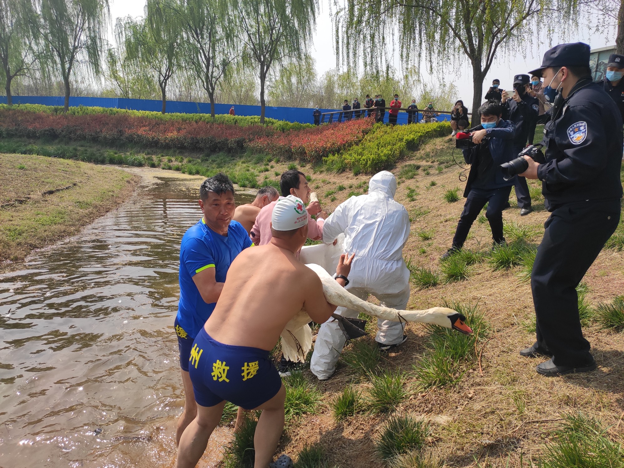 在王更林和队友及围观群众的配合下,两只天鹅被抱上岸。动物专家董朝伟检查后表示,这是两只疣鼻天鹅,其中的母天鹅被游客掉落在水里的风筝线缠绕脚和翅膀,被勒后轻微受伤,导致其无法正常游泳捕食,好在救护、治疗的都比较及时,并无大碍。