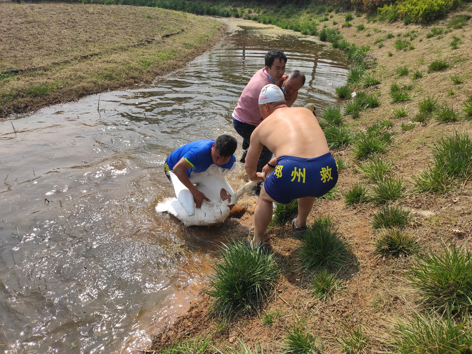 王更林告诉大河报·大河客户端记者,救援队员赶到现场勘查后,发现两只天鹅在水上派出所北侧水沟里,紧紧依偎,水并不深,能看到水面漂浮着长长的丝线,担心使用网捕捉可能伤害到天鹅,王更林和救援队副队长秦德良商量后,决定采取围堵的方法。