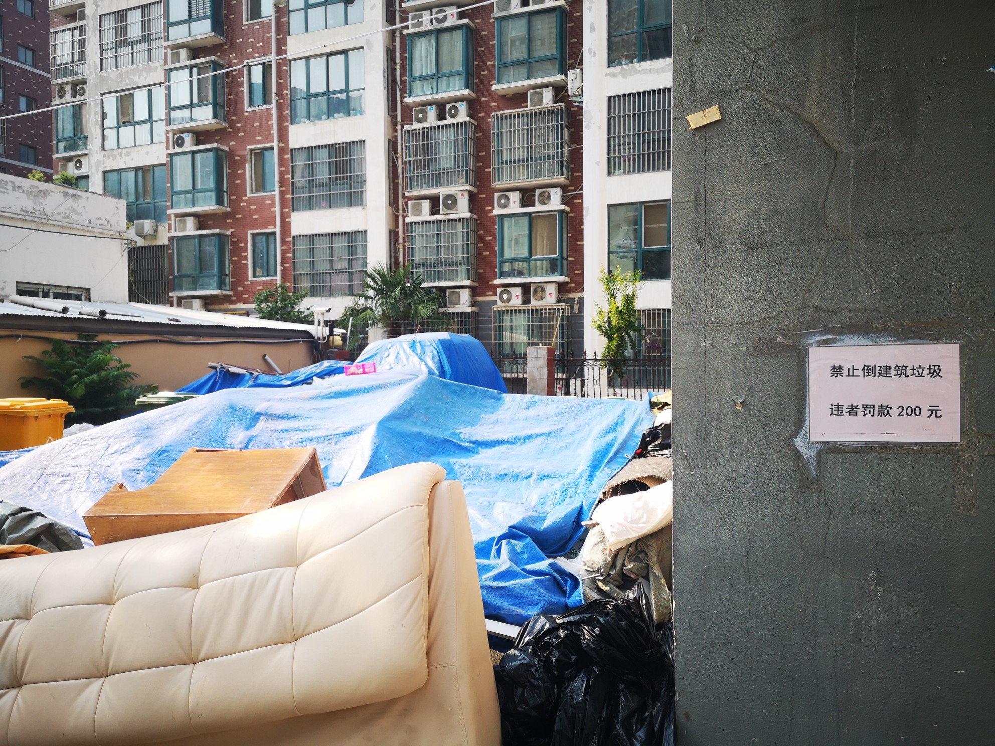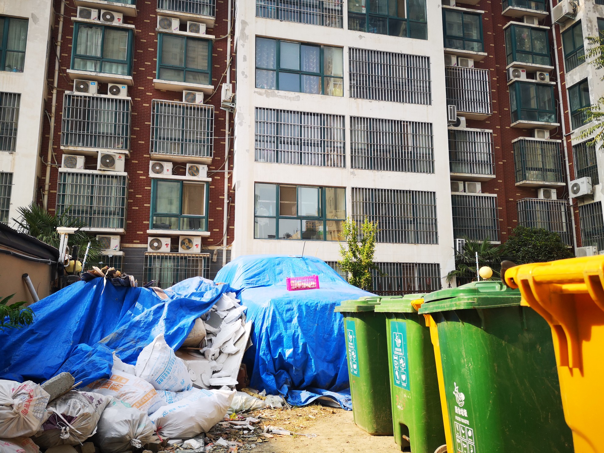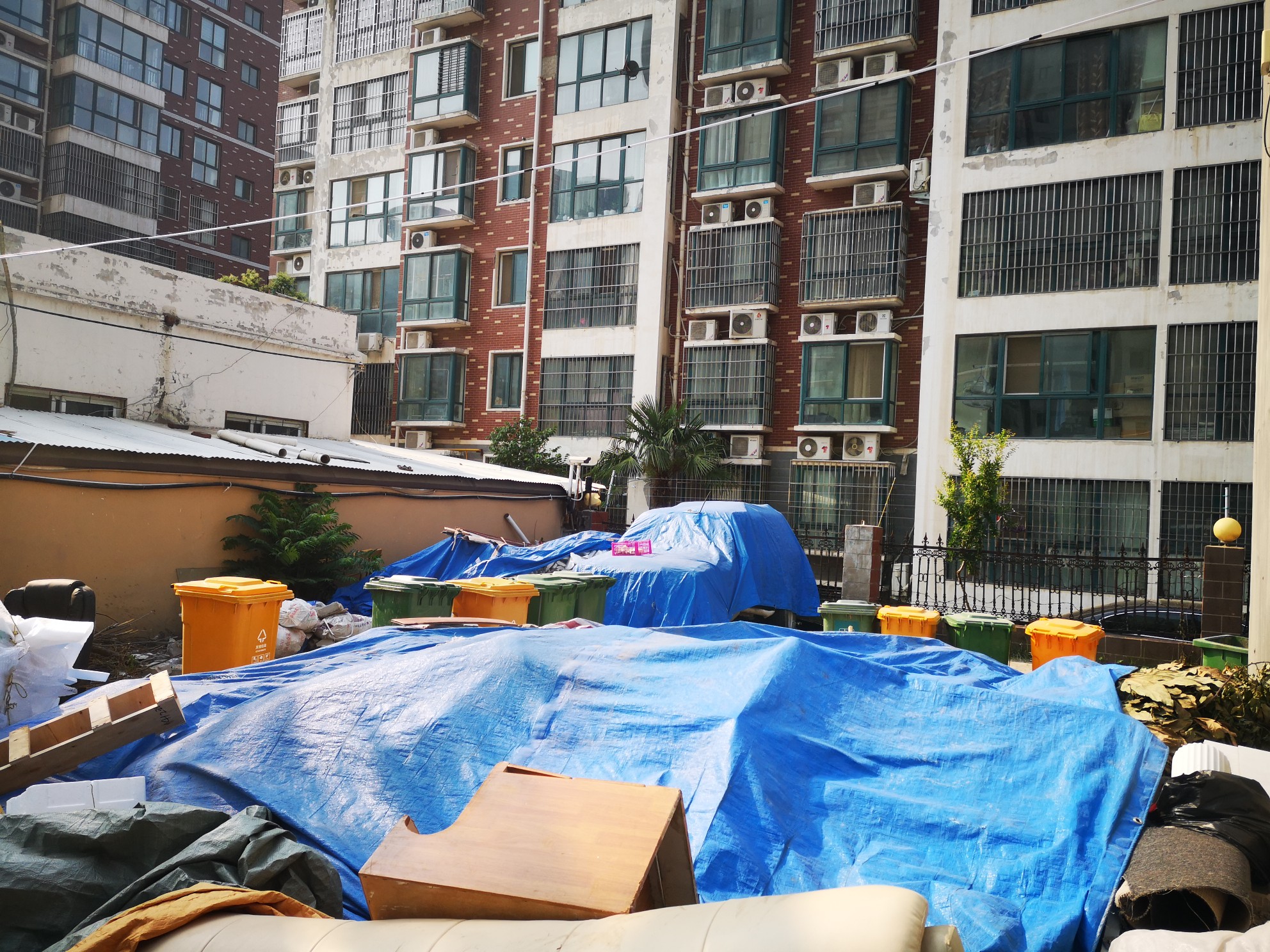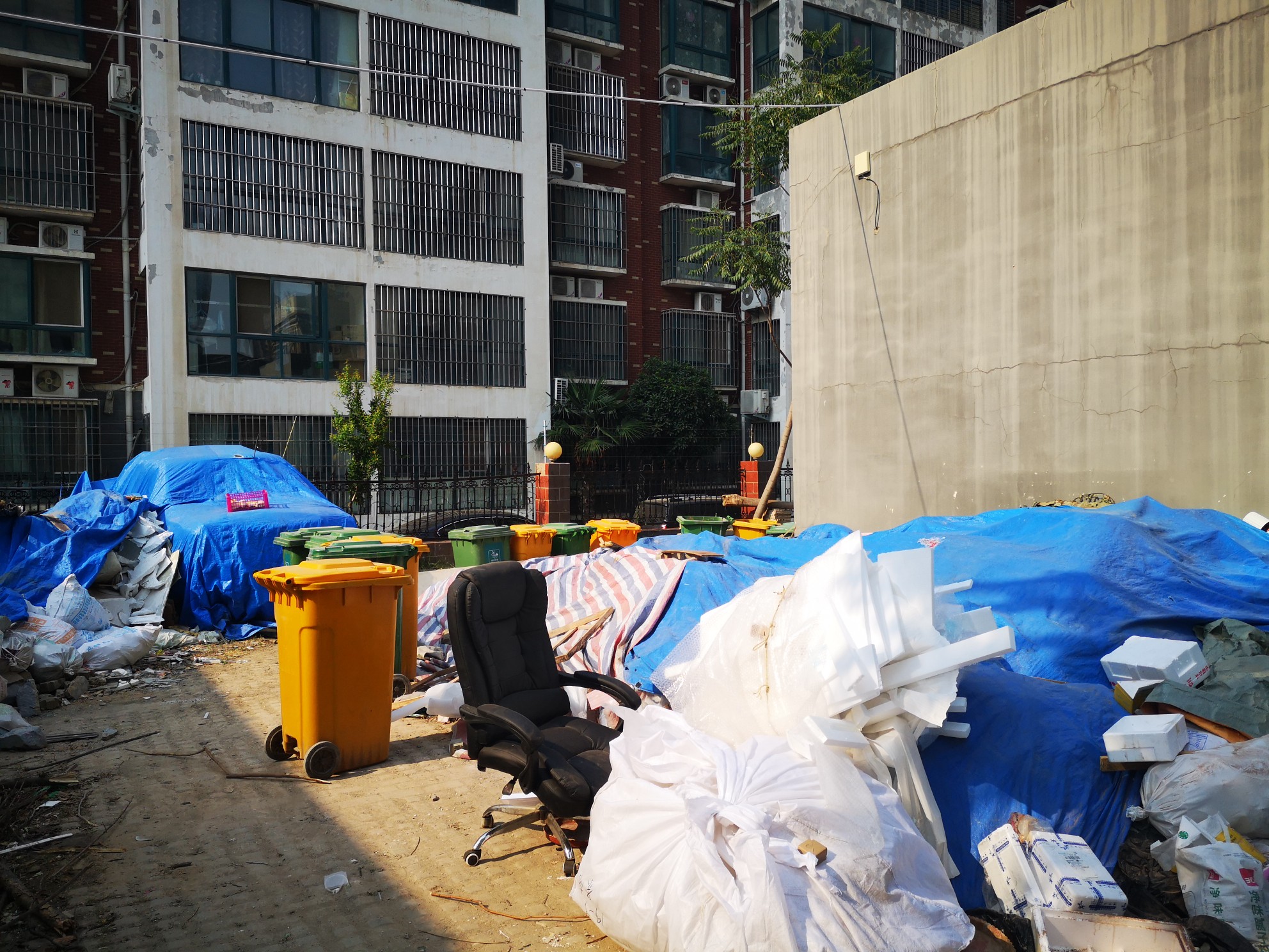 在小区10号楼南侧,一墙之隔的外面就是金鹏时代小区,透过铁栅栏,记者注意到,里面堆积着大量建筑垃圾,上面覆盖着篷布。旁边还有多个垃圾桶,及堆积的一些生活废旧物品。