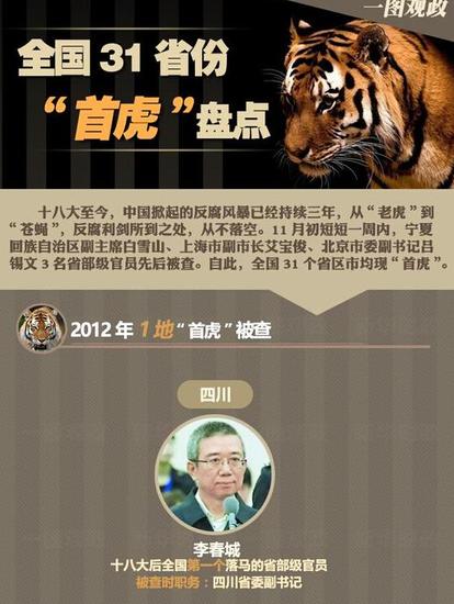 上周,中纪委再次密集“打虎”,艾宝俊、吕锡文、孙清云、姚刚四人落马,由此结束了上海、北京两地“无虎”的格局,全国31个省区市均有省部级官员落马。据中国经济网记者不完全统计,自十八大以来已有130名省部军级官员被查。