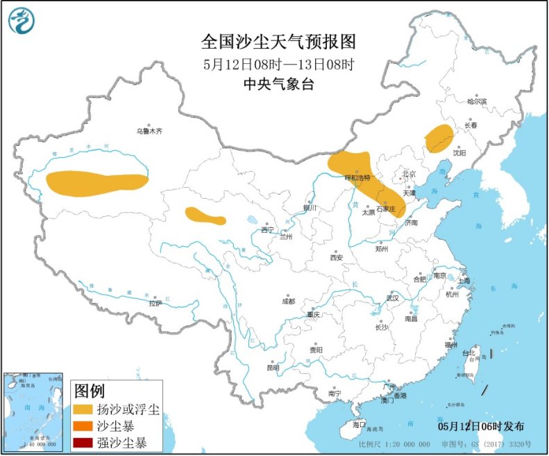 中央气象台预计,今天,北方沙尘影响区域收缩, 内蒙古中部和东南部、山西北部、河北中南部、新疆南疆盆地、青海柴达木盆地等地有扬沙或浮尘天气。