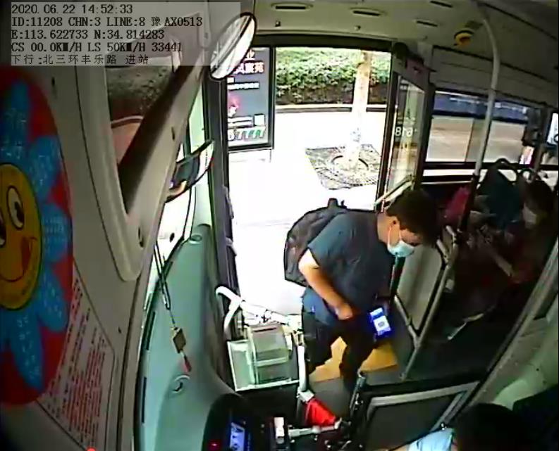 当车辆行驶至丰庆路站时,一位男士在下车时看到座位上放着一个包,便走到前门处将包交给了当班车长张通,随后便匆匆下车。