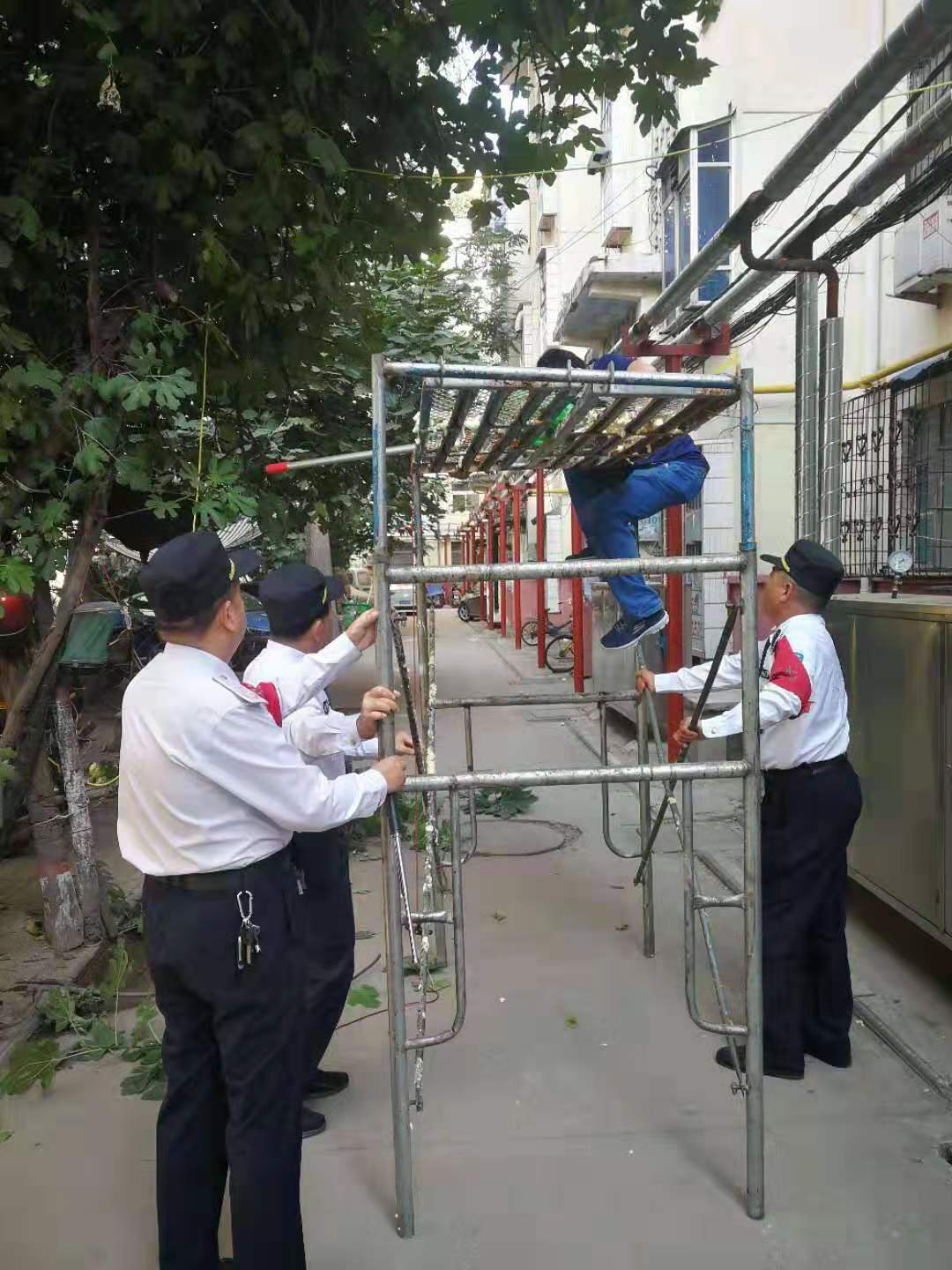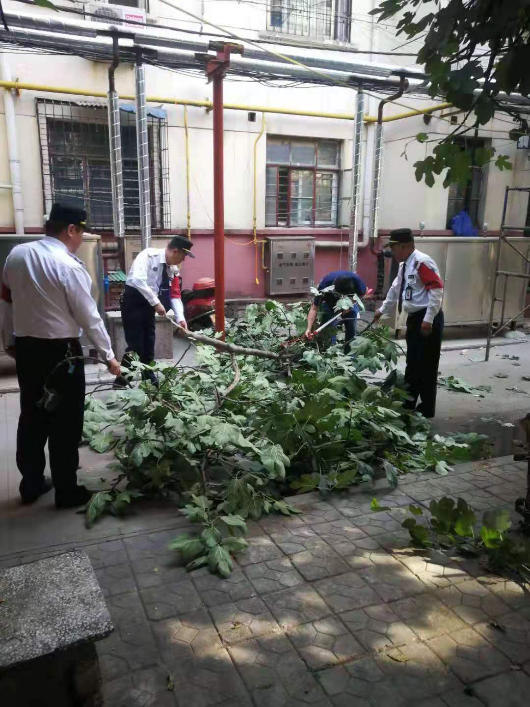 五名队员和社区居民一起,经过半个多小时的工作,把树上的安全隐患排除。