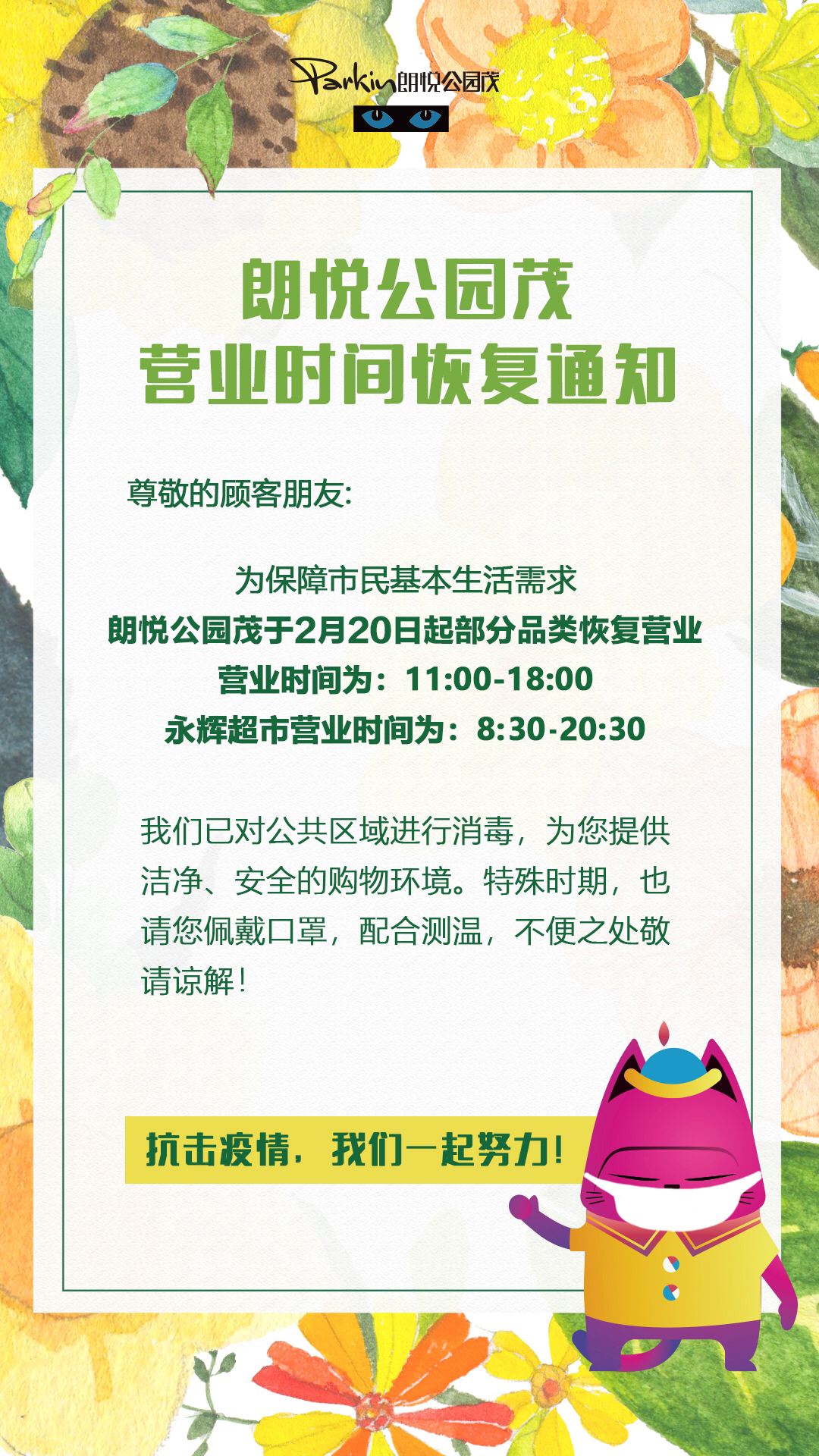 2月21日起恢复营业,营业时间为10:00~18:00,超市营业时间与购物中心一致。