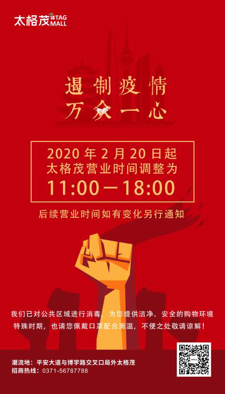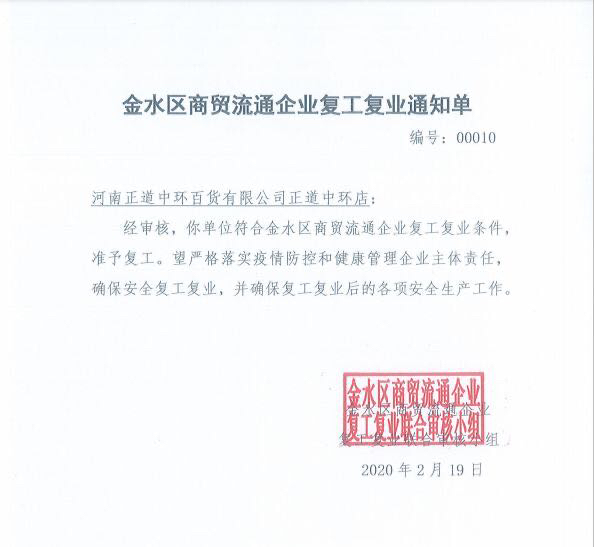 2月19日,郑州市新冠肺炎疫情防控领导小组办公室下发了疫情防控20号公告。公告指出,根据疫情形势,金水、二七、中原、管城、惠济及郑东新区等域内企业可与市防控办第16号通告中明确的我市疫情轻微地区的企业同步复工复产(我市规定的负面清单行业除外)。具备复工复产条件的企业向属地县(市、区)及开发区行业主管部门提交《企业疫情防控工作承诺书》后,即可复工复产。公告下发的当天下午郑东新区服务业联合审批小组就向太格茂、永威木色等购物中心发出通知,要求企业上报《企业疫情防控工作承诺书》。对《企业疫情防控工作承诺书》准备完备的太格茂不再现场查验后下发复工复业通知书,企业可自主决定复工复业时间。永威木色《企业疫情防控工作承诺书》完备后也将会企业自主决定近期开业的时间。