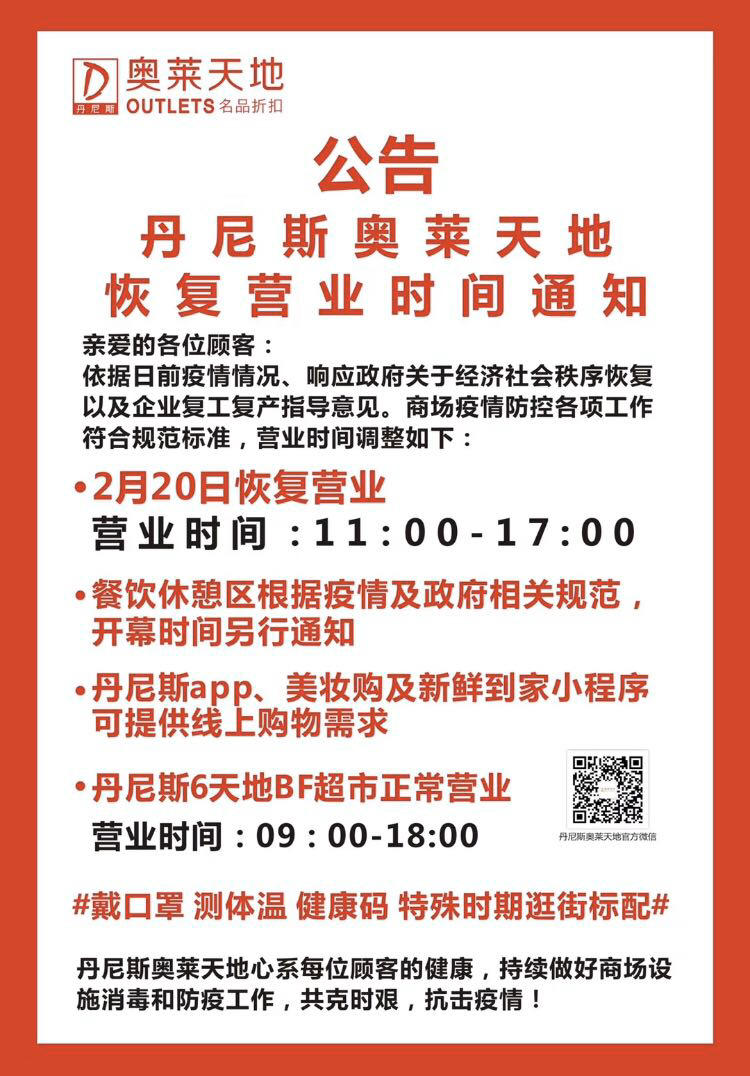 丹尼斯奥莱天地2月20日恢复营业,营业时间为11:00~17:00,餐饮休憩区根据疫情及政府相关规范,开业时间另行通知。超市营业时间为9:00~18:00。