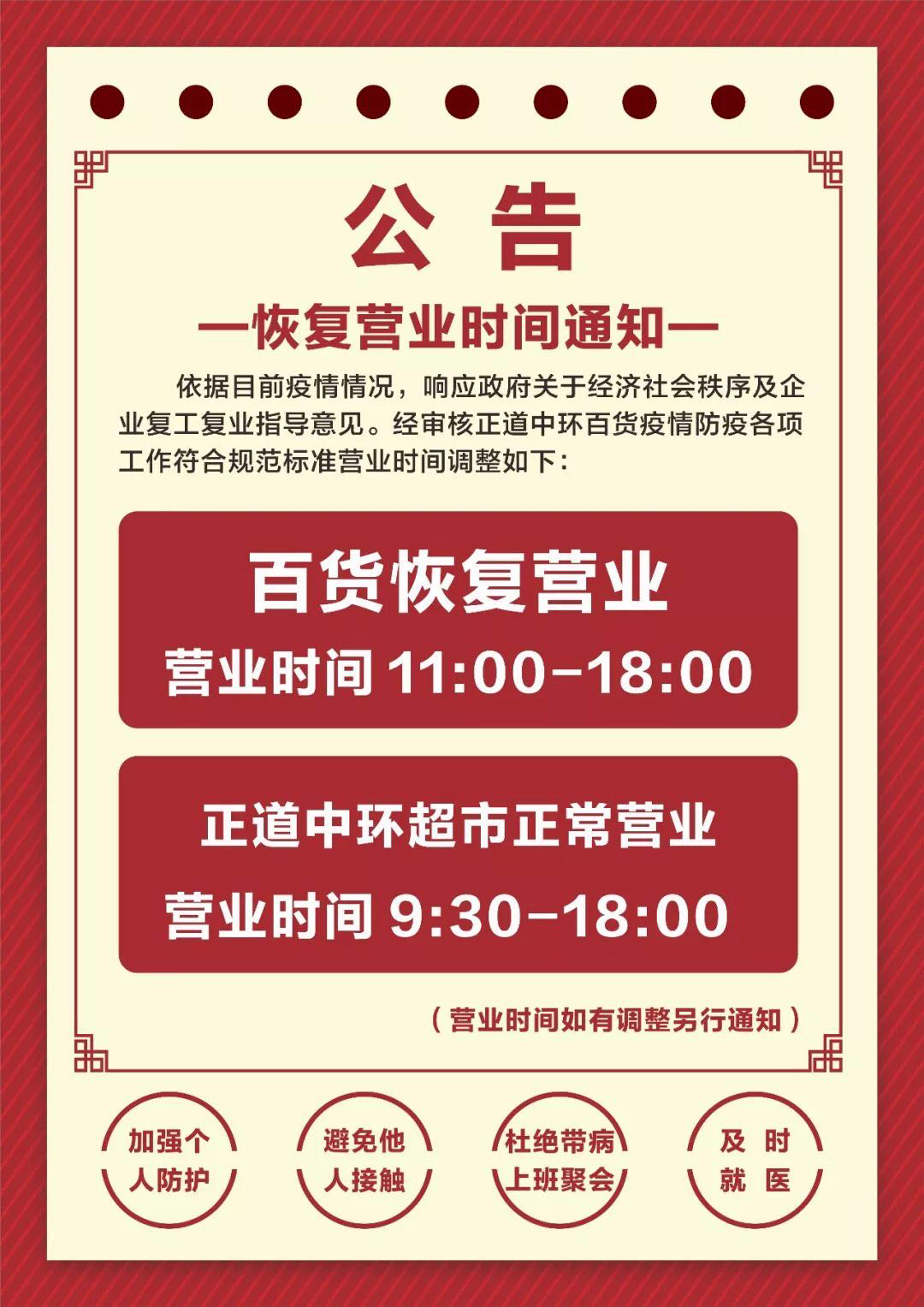 2月19日恢复营业,营业时间为11:00~18:00,正道中环超市营业时间为9:30~18:00。