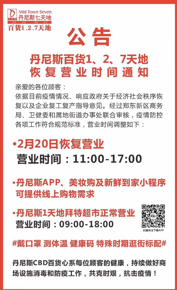 丹尼斯百货1、2、7天地2月20日恢复营业,营业时间为11:00~17:00,丹尼斯1天地拜特超市营业时间为9:00~18:00。