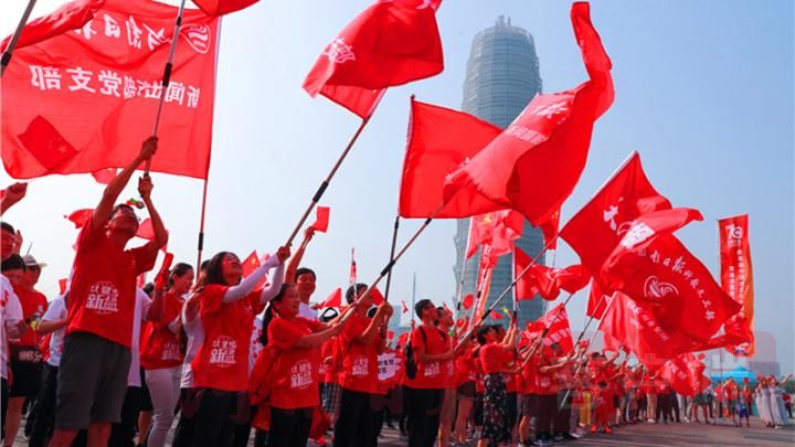 来自省委省直工委、省文明办的党员志愿者和社会青年志愿者以及河南日报报业集团员工,围绕美丽的如意湖畔开展健步走公益活动,健步走全程7公里,寓意新中国成立70年和河南日报创刊70年的风雨历程。
