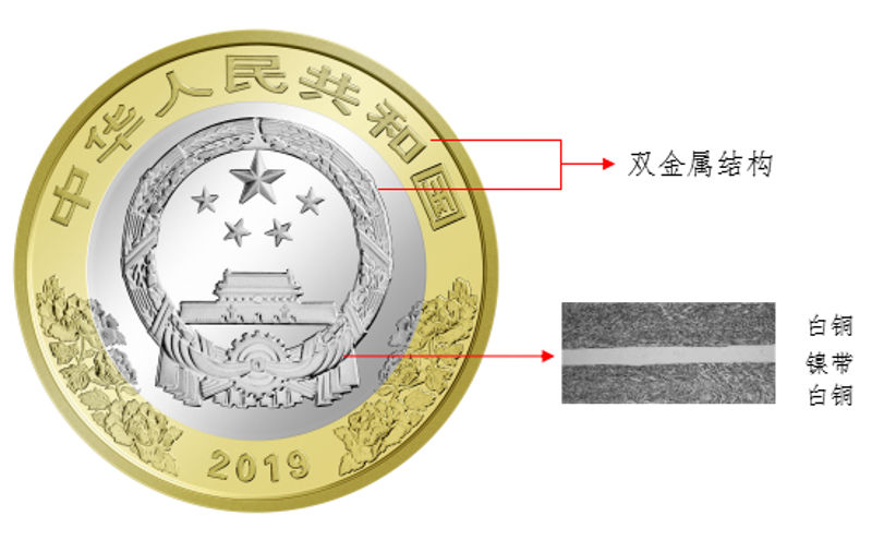 硬币外环为黄铜合金,内芯为具有独特机读性能的镍带复合白铜造币材料。