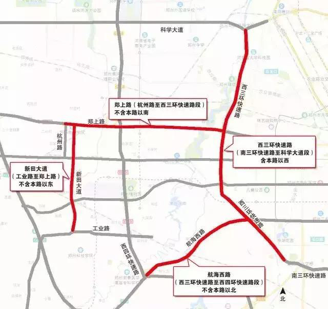 2、新田大道(工业路至郑上路)不含本路以东、郑上路(杭州路至西三环快速路段)不含本路以南、西三环快速路(南三环快速路至科学大道段)含本路以西、航海西路(西三环快速路至西四环快速路段)不含本路以北的合围区域及区域内道路对各类货车和危险品运输车实施限行。