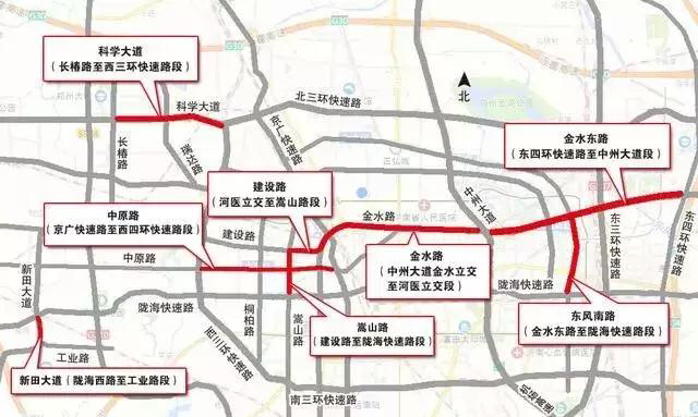 5、视情况对金水路(中州大道金水立交至河医立交段)、建设路(河医立交至嵩山路段)、嵩山路(建设路至陇海快速路段)、中原路(京广快速路至西四环快速路段)、金水东路(东四环快速路至中州大道段)、东风南路(金水东路至陇海快速路段)、科学大道(长椿路至西三环快速路段)、新田大道(陇海西路至工业路段)采取交通流量临时调控措施,削减以上道路的交通流量,但不实施临时交通管制。