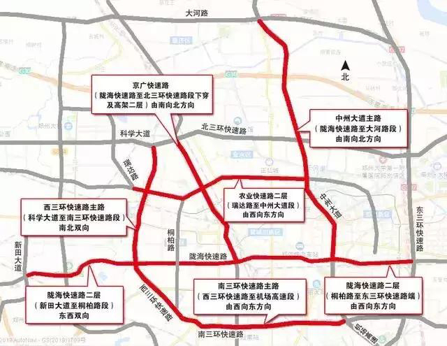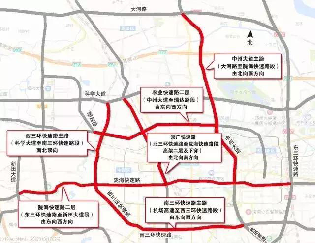 3、视情况对陇海快速路二层(东三环快速路至新田大道段)由东向西方向、西三环快速路主路(科学大道至南三环快速路段)南北双向、农业快速路二层(中州大道至瑞达路段)由东向西方向、南三环快速路主路(机场高速至西三环快速路段)由东向西方向、京广快速路(北三环快速路至陇海快速路段高架二层及下穿)由北向南方向、中州大道主路(大河路至陇海快速路段)由北向南方向实施短时段临时交通管制。