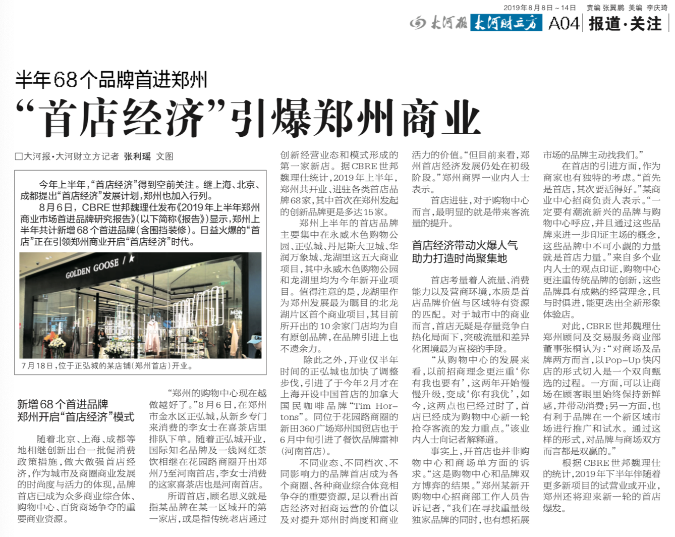 所谓首店,顾名思义就是指某品牌在某一区域开的第一家店,或是指传统老店通过创新经营业态和模式形成的第一家新店。据CBRE世邦魏理仕统计,2019年上半年,郑州共开业、进驻各类首店品牌68家,其中首次在郑州发起的创新品牌更是多达15家。