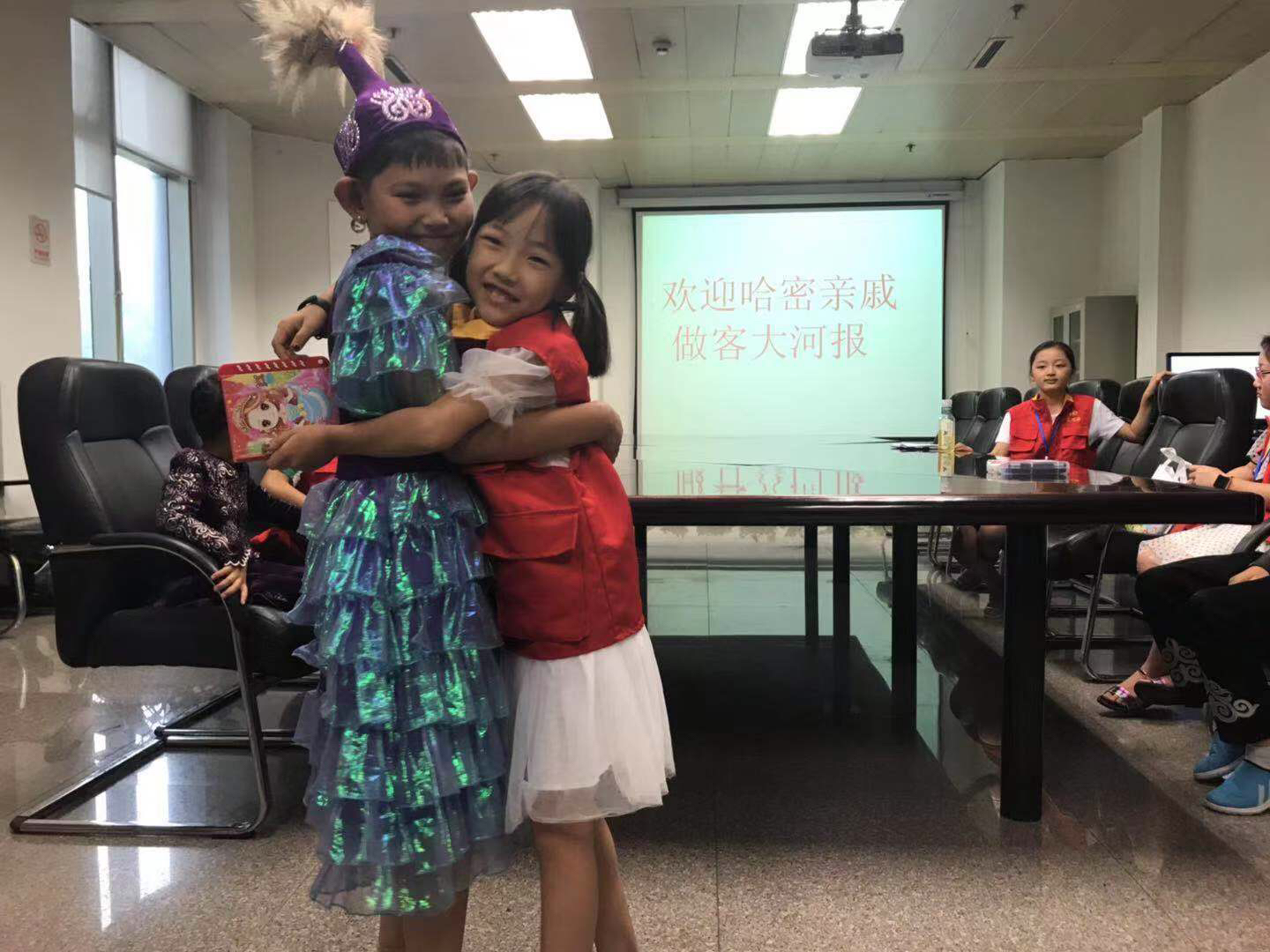 做自我介绍,互留地址和联系方式……孩子们相聚在一起,很快由生疏到熟悉,不一会儿,来自郑州市文化路一小三年级的段雨含小朋友,就微笑着跟刚结识的哈萨克族新朋友巴合江·努尔哈孜紧紧握手,还大大方方地送上热情的拥抱。