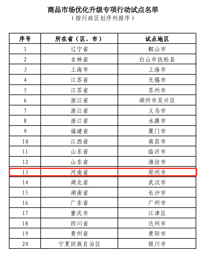 根据相关要求,商务部等7单位共同组织专家对地方申报材料进行评审,确定了商品市场优化升级专项行动试点名单,上海、广州、厦门、郑州等20个试点地区在列。