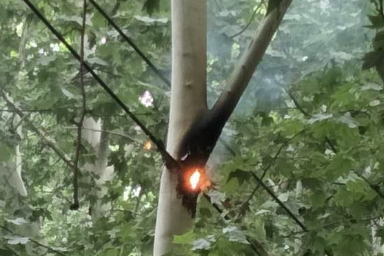 “噼噼叭叭” 郑州一路口空中高压线冒火引燃行道树