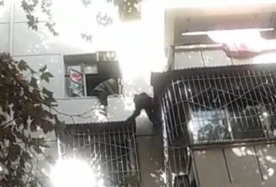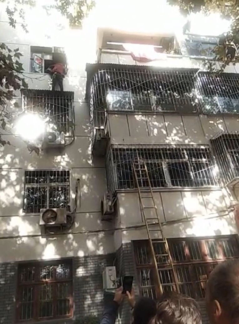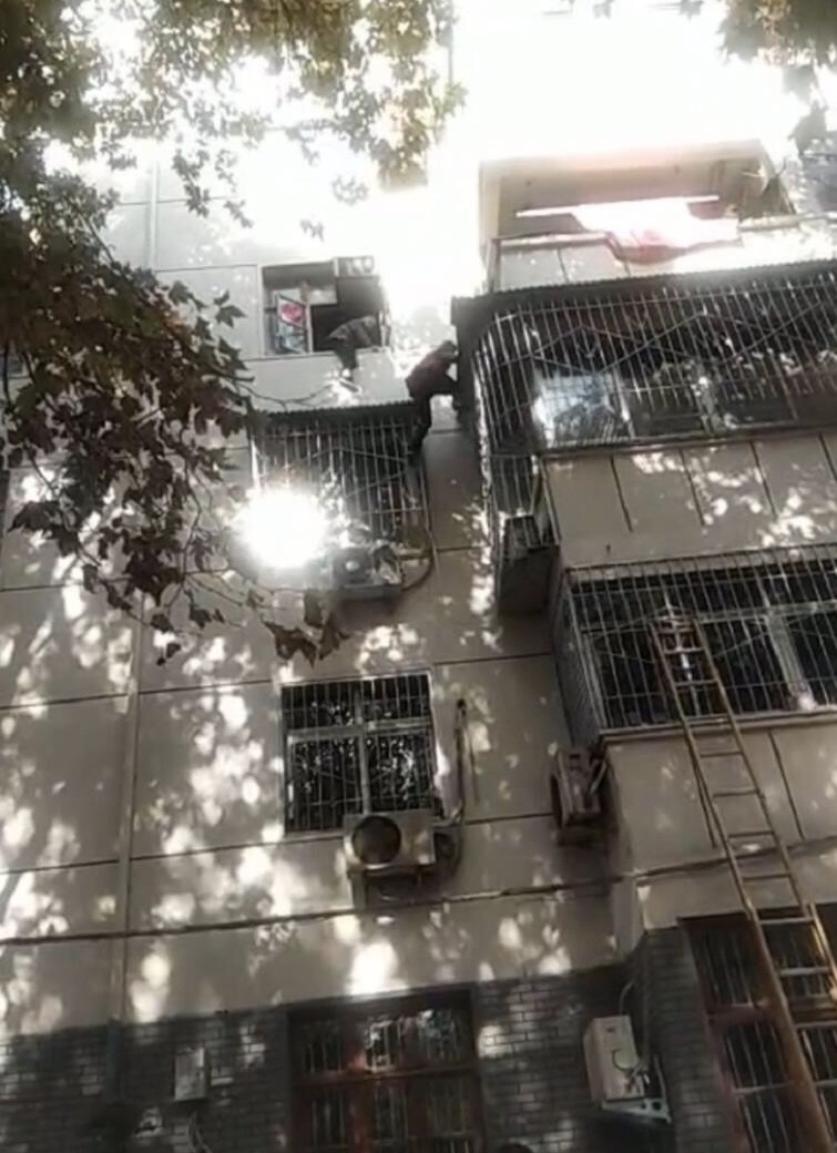 87岁老太晒太阳被困四楼窗外,小伙站在防盗网上托护10分钟