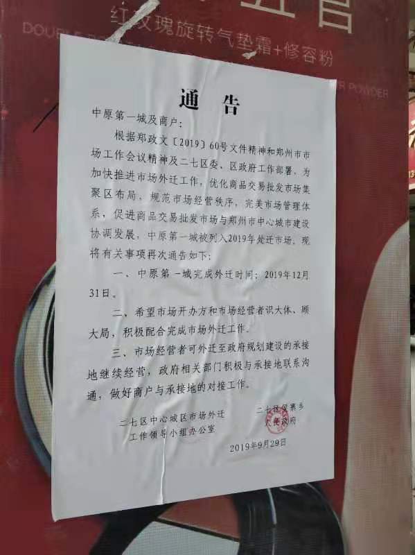 和中原第一城外迁境遇相似,还有5家市场年底前完成外迁。大河报·大河客户端记者查阅郑州市政府关于印发郑州市商贸市场提质发展三年行动计划的通知(郑政文【2019】60号),中原第一城、万客隆家具城、河南汽贸中心、陈砦(双桥)花卉基地、郑州信基调味品城、经开铝材市场这6家市场2019年12月31日前完成外迁。采访期间,记者了解到,上述6家市场的不少商户已开启了外迁,不少商户们选择落户华南城、万邦批发市场、新密等地。