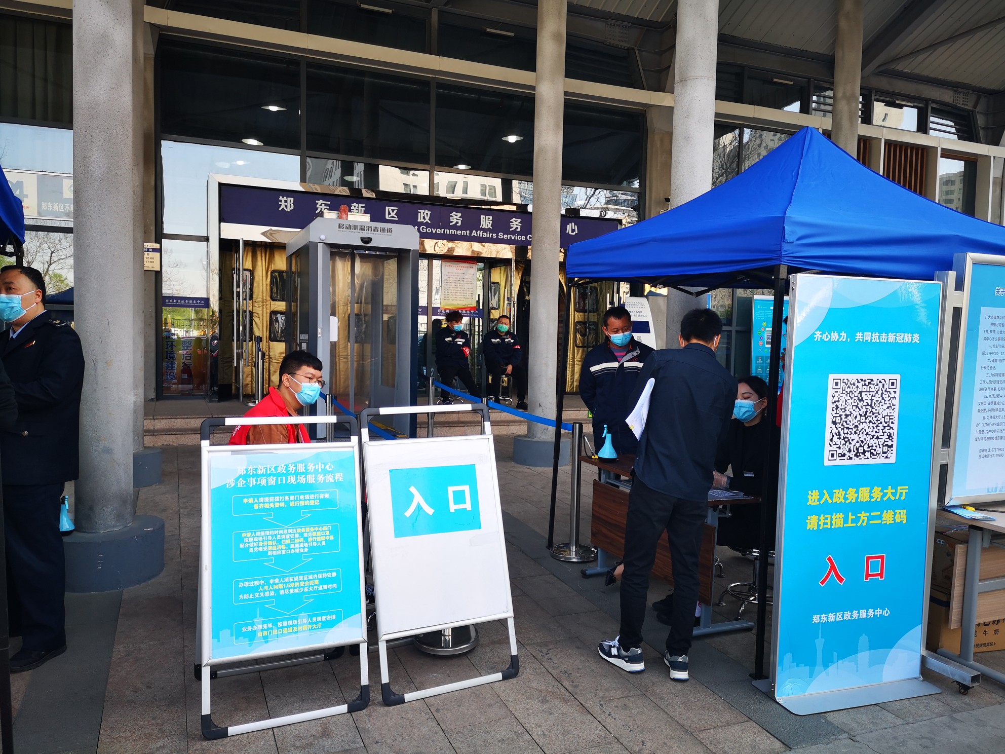 在郑州市不动产登记中心郑东新区分中心门口,两名工作人员正在门口值班,前来办理业务的市民自觉排队,保持1.5米间距。