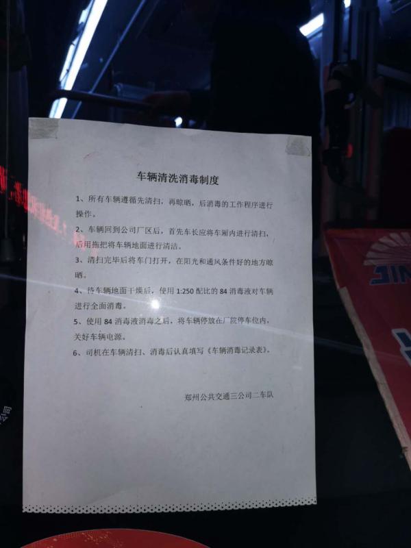 2月17日凌晨6点,郑州市公交三公司二车队对即将运行的定制服务公交车辆进行再次全面消毒、通风、安全设备检查;对定制服务车长进行不定时检测体温;并将车辆消毒记录、车长体温检测记录、清洁消毒制度粘贴在每辆定制服务车辆上。