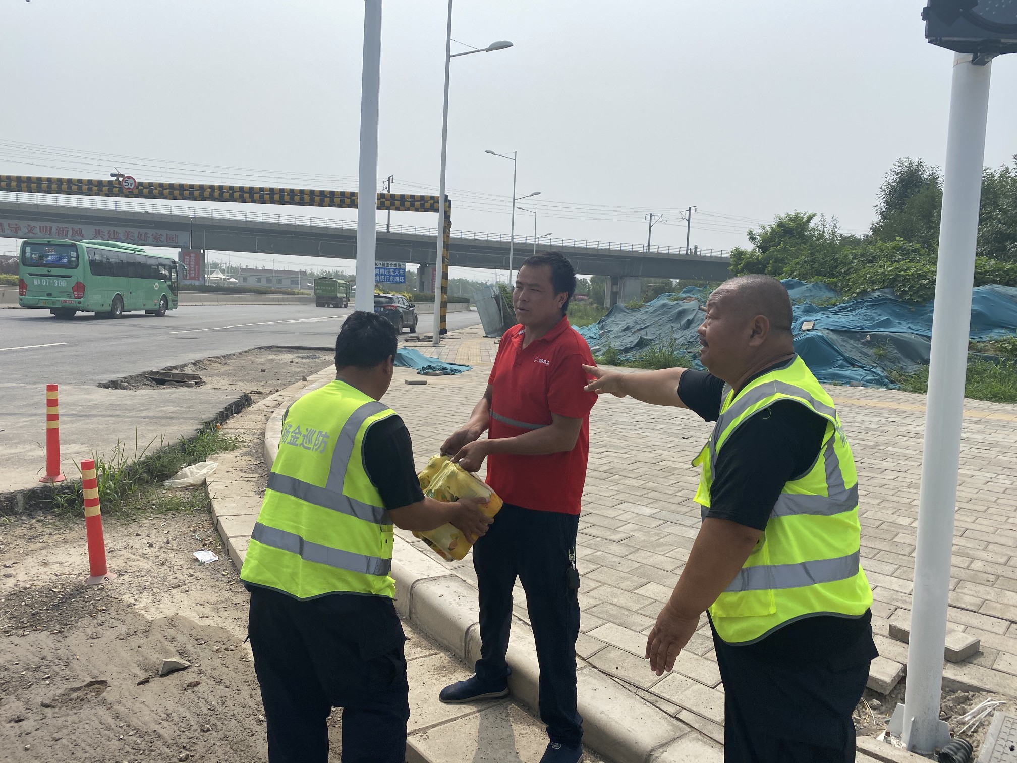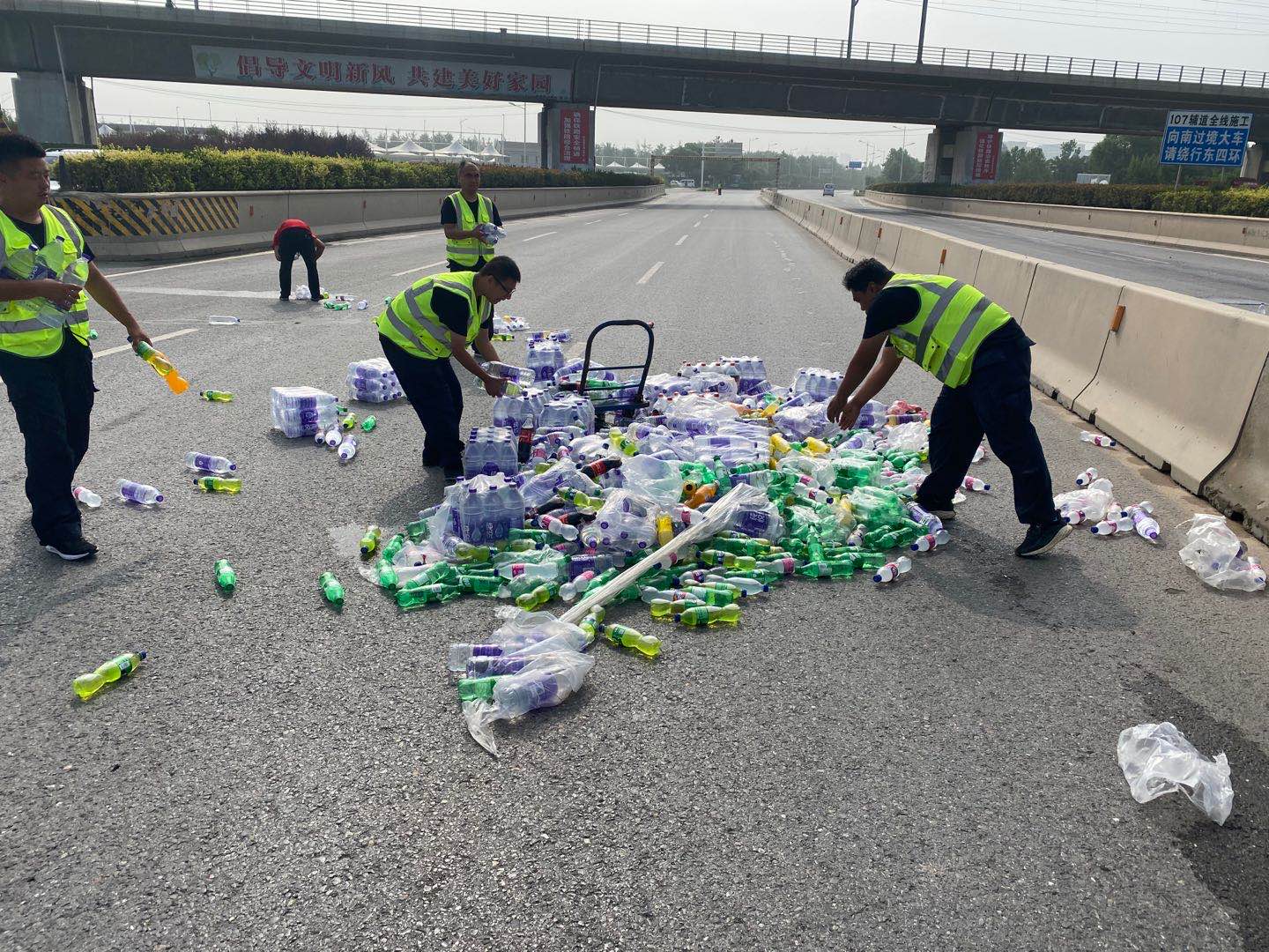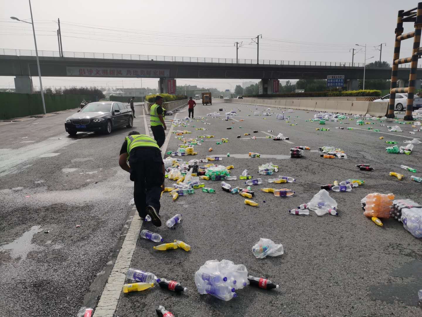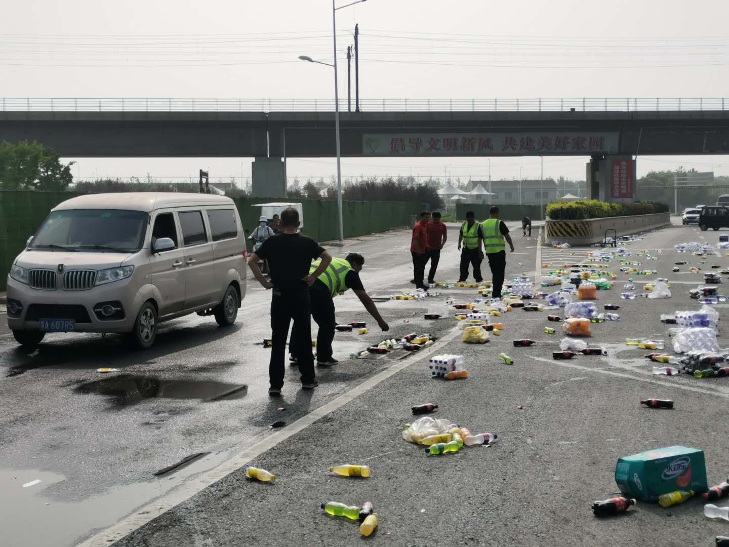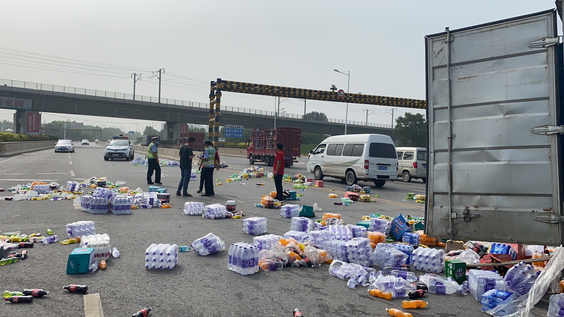 这件事儿,发生在6月29日上午9点钟左右。据金水区杨金路巡防中队李建鹏介绍,事发时,他和队友张广平、王俊等人巡逻到杨金路与经三街附近,突然听到一声巨响,循声望去,只见一辆水泥罐车与一辆小型货车相撞,“小货车拉的东西,散落满地。” 几人上前查看获知,从这该车散落的饮品包括饮料、矿泉水等,合计有1000多件。它们从车厢甩出后,受惯性的力量作用,数瓶饮品外包装破裂,一瓶瓶饮品滚落了4个车道。“嘿,不能趁机捡人家的饮料喝!”在现场,有人趁机想顺手拿饮品,被几名巡防队员阻止,并留守现场维持秩序。